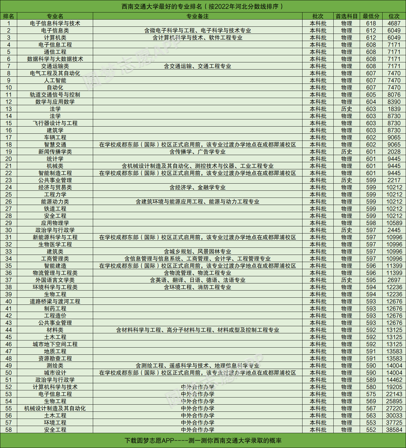 由于四川省教育考试院目前还未公布2022年的专业分,所以本文将以西南交通大学在河北2022年高考的录取情况为例,为大家展示西南交通大学最好的专业排名。