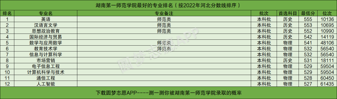 由于湖南省教育考试院目前还未公布2022年的专业分,所以本文将以湖南第一师范学院在河北2022年高考的录取情况为例,为大家展示湖南第一师范学院最好的专业排名。