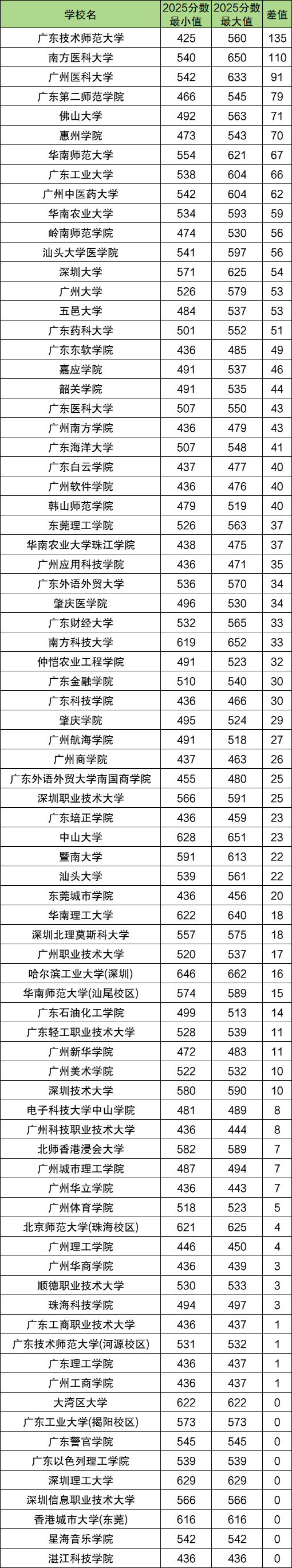 2025年广东本科大学录取分数线:历史组424分到627分、物理组425分到662分。其中分数线最低的公办本科大学是广东技术师范大学(历史类424分、物理类425分录取),广东高考各校录取分数线详情如下文所示,2026届考生可查阅。