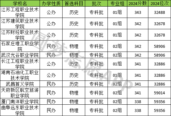 在江苏省340分左右(338分-343分之间)的可以上大学,专科历史类6所;其中公办院校5所,有江苏工程职业技术学院(343分)、江苏建筑职业技术学院(342分)、江苏财经职业技术学院(342分)等;民办院校1所,为武昌首义学院(341分)。