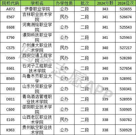 在山东省340分左右(338分-343分之间)的可以上大学有13所,其中公办院校9所,在山东二段录取的有乌鲁木齐职业大学(339分)、山东外贸职业学院(339)、青岛酒店管理职业技术学院(339分)等。民办院校4所,有吉林职业技术学院(341分)、广州康大职业技术学院(340分)、西安交通工程学院(340分)等。