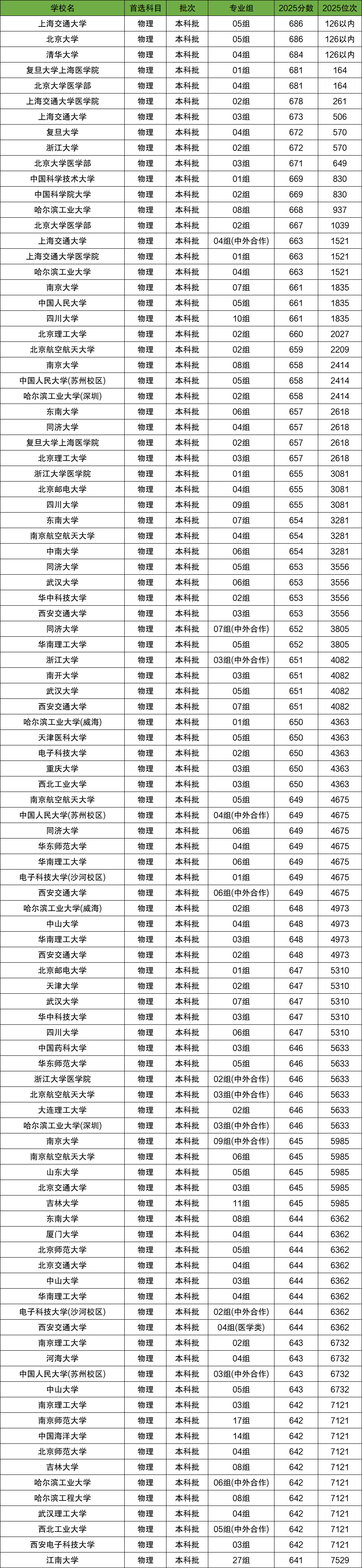下面是2025年在江苏省物理类录取分数线及位次排名前百强高校一览表:
