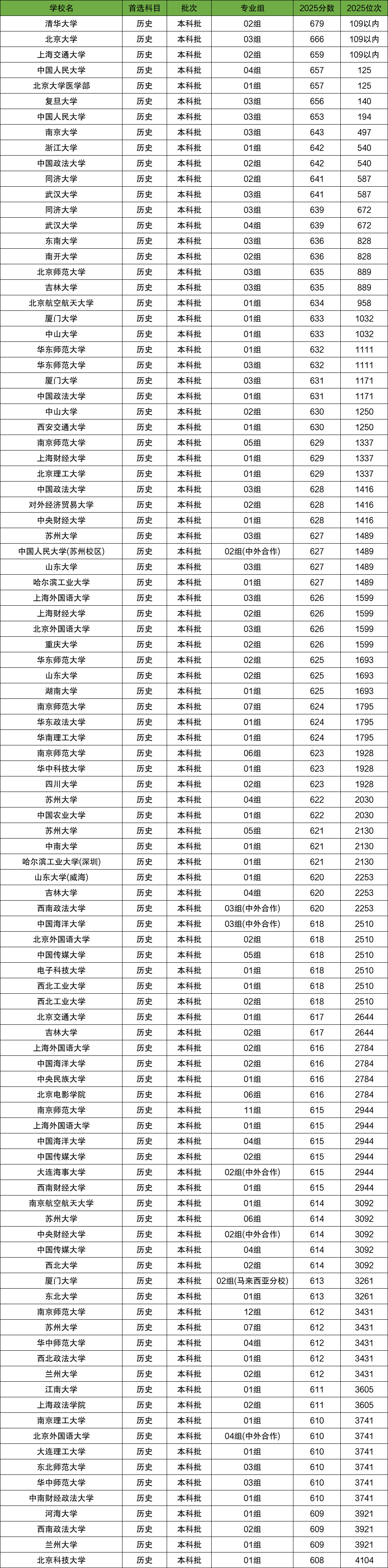 下面是2025年在江苏省历史类录取分数线及位次排名前百强高校一览表:
