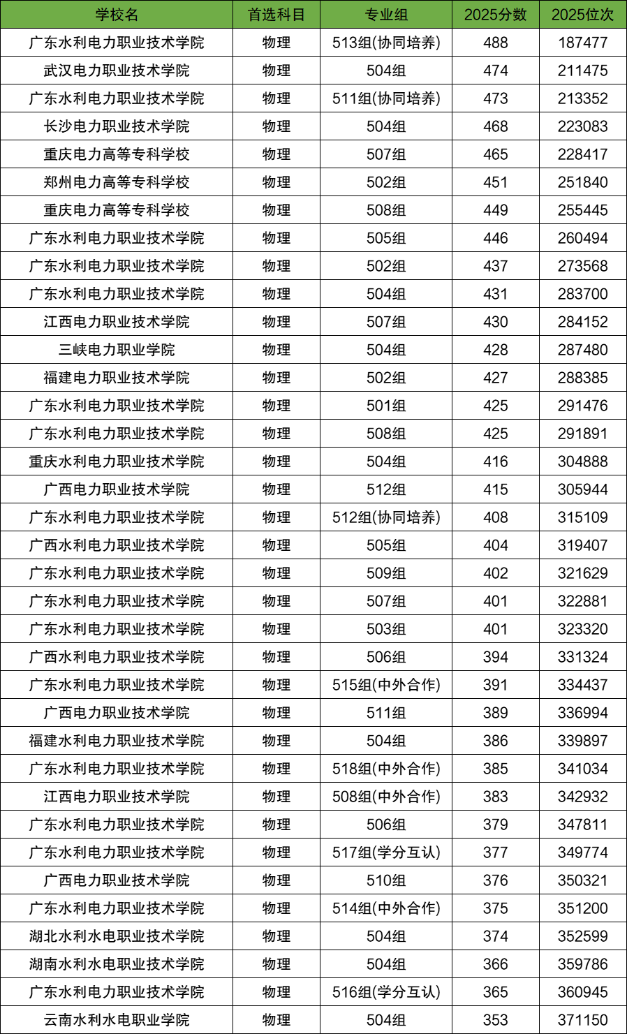 物理类高分段的电力专科大学专业组有:广东水利电力职业技术学院513组(协同培养)、武汉电力职业技术学院504组、广东水利电力职业技术学院511组(协同培养)、长沙电力职业技术学院504组、重庆电力高等专科学校507组等,这些大学2025年高考最低录取分数线均在465分及以上。