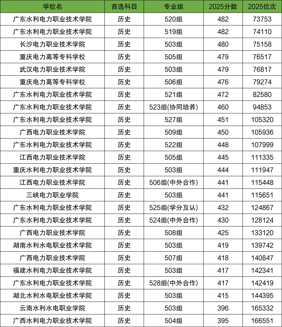 2025年历史类电力专科大学专业组名单共计25个,录取分数线范围是395分到482分。低分段的电力专科大学专业组有福建水利电力职业技术学院503组、广东水利电力职业技术学院528组(中外合作)、湖北水利水电职业技术学院503组、云南水利水电职业学院503组、广西水利电力职业技术学院504组。