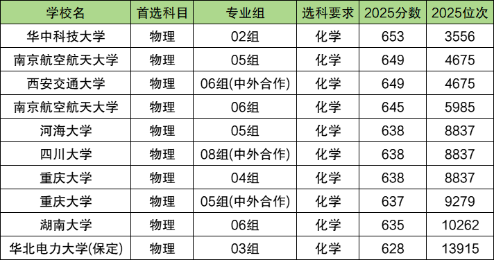 物化政可报考的电气工程及其自动化大学中,录取分数线最高的是华中科技大学,2025年02组最低分653分,是收分最高的。排名前三的还有南京航空航天大学05组(649分)、西安交通大学06组(中外合作)649分。