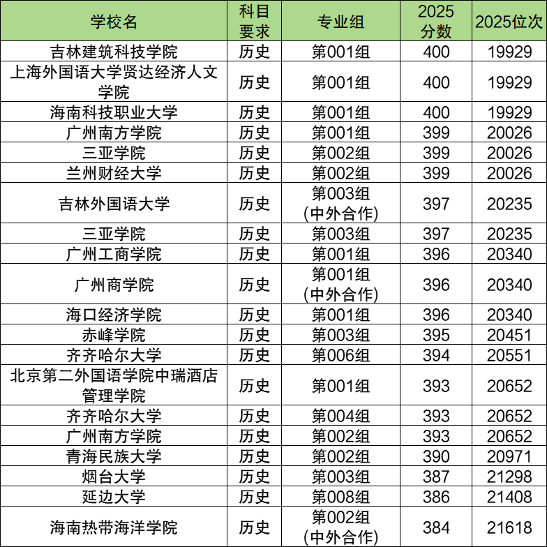 2025年吉林历史类本科线附近(384分到400分)能上的本科院校一共有17个,排名靠前的有吉林建筑科技学院(第001组,19929名)、上海外国语大学贤达经济人文学院(第001组,19929名)、海南科技职业大学(第001组,19929名)等,这些属于本科线附近考生可以冲一冲的学校。
