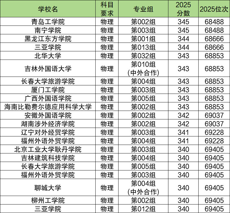 2025年吉林物理类本科线附近(340分到345分)能上的本科院校一共有18个,排名靠前的有青岛工学院(第002组,68488名)、南宁学院(第003组,68488名)、黑龙江东方学院(第001组,68666名)等,这些属于本科线附近考生可以冲一冲的学校。