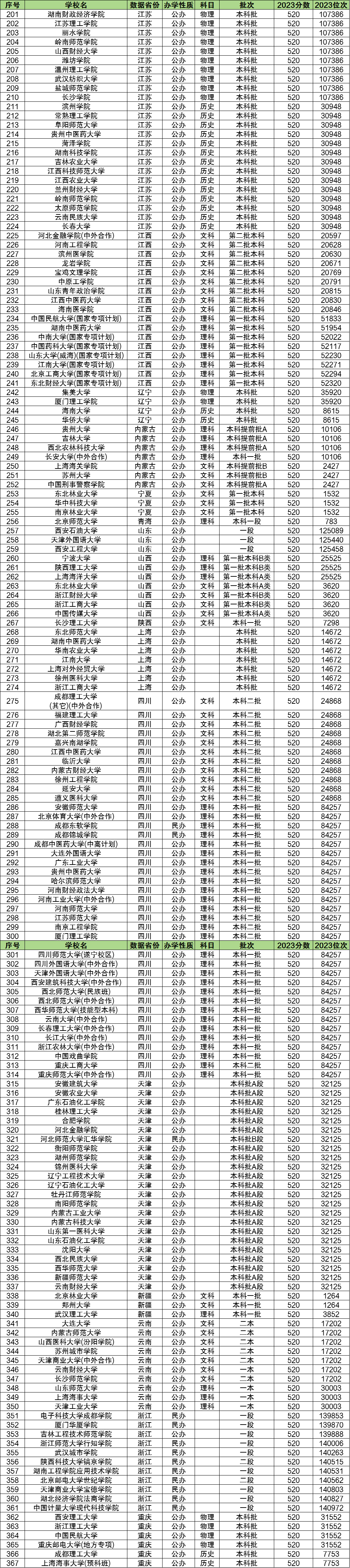 根据圆梦志愿APP提供的数据,小编为大家整理了全国各省市2023年高考最低录取分数线为520分的大学名单,各省合计一共有367所,其中含336所公办大学、29所民办大学、2所中外合作办学院校。下图为具体的名单: