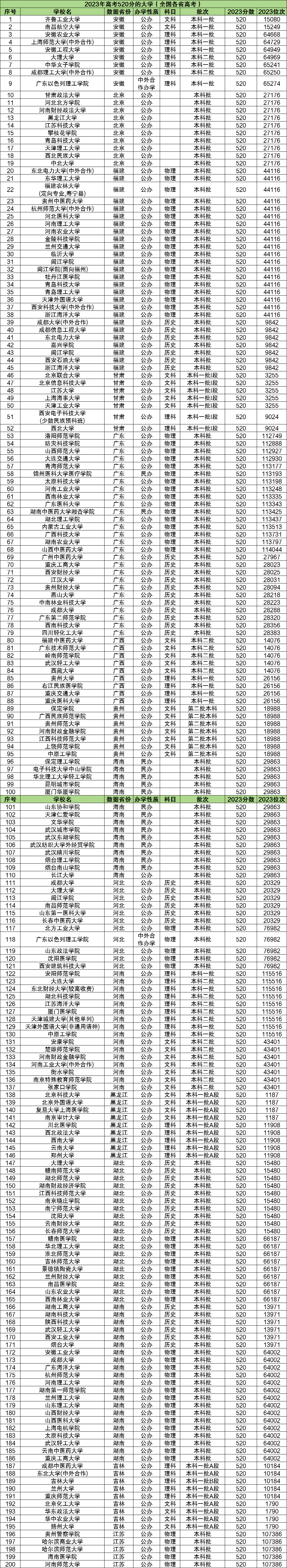 本文将为大家奉上全国各省高考2023年最低录取分数线为520分的大学院校名单汇总,供新高考及旧高考成绩在520分左右的文理科同学参考。