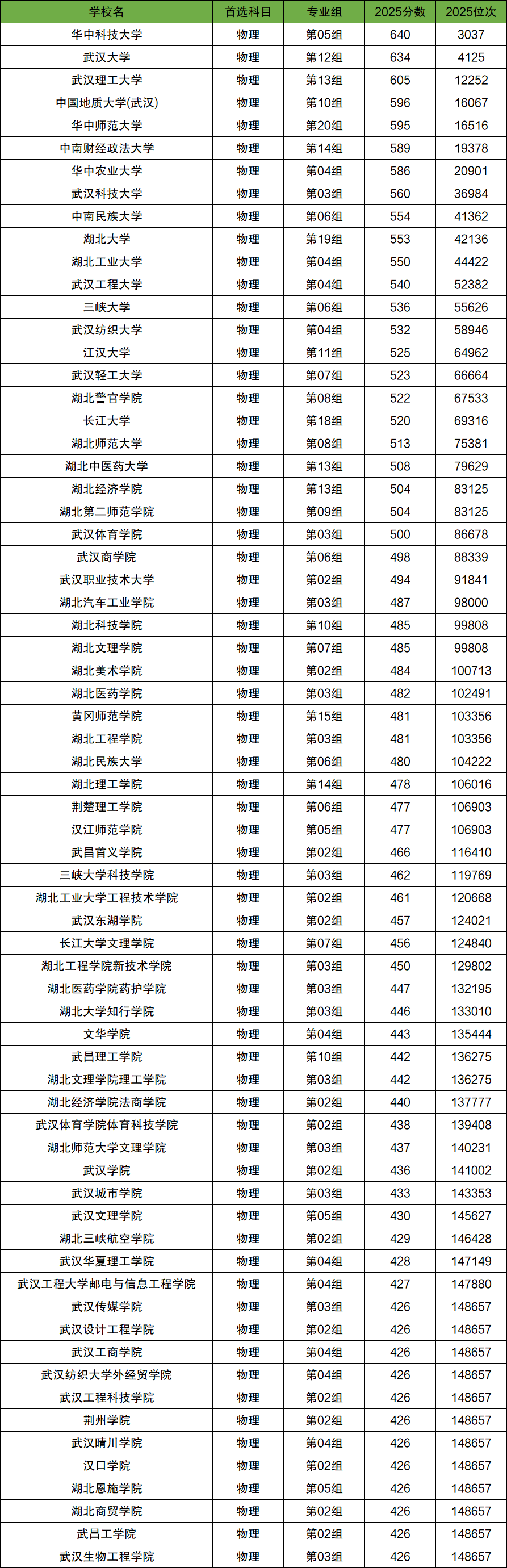 2025年高考湖北省内本科大学物理类录取分数线范围在426分~640分之间,其中录取分数线最高的是华中科技大学(第05组),2025年的最低投档线为640分。