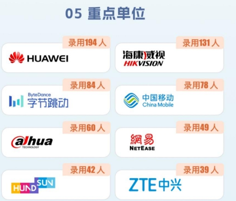 就业单位:华为是学校的第一大用人单位,此外学校就业主要单位还包括移动、网易、字节跳动、海康威视等;