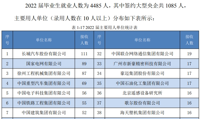 就业单位:进入国企的毕业生占比34.65%,签约的大型单位包括长城汽车、国家电网、重型汽车集团等;