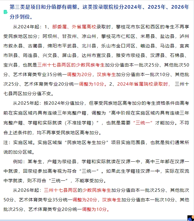 从2026年起,三洲十七县两区少数民族地区的少数民族考生统一加20分、汉族考生统一加10分,攀枝花市东区、西区的考生将不再加分。