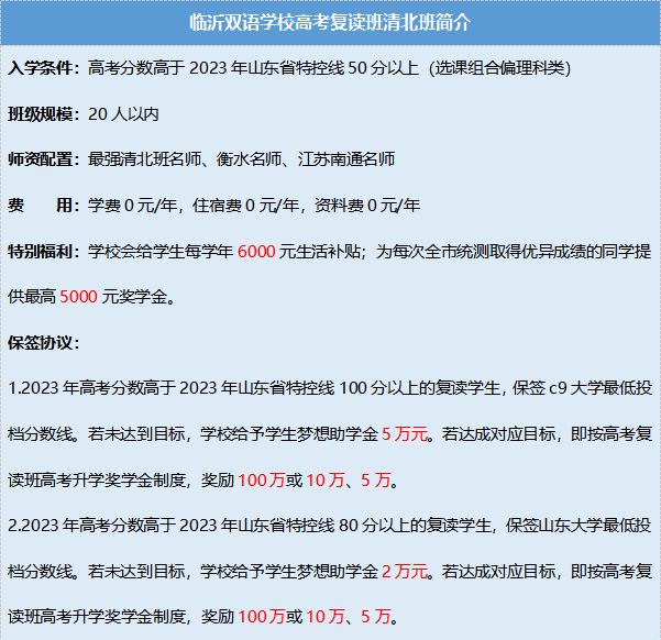 山东高考可以复读的学校有:临沂双语学校、国科大青岛附属学校等。根据最新山东省高三考生高考复读规定来看,虽然山东高考是允许复读的,即便已经被大学录取复读也是没有限制,但公办学校招收补习班的考生数量非常少,因此我们可以考虑的幅度院校主要以校外复读机构、民办私立高中为主,那么我们为大家推荐几所相对适合高三复读生考虑的补习班中学。