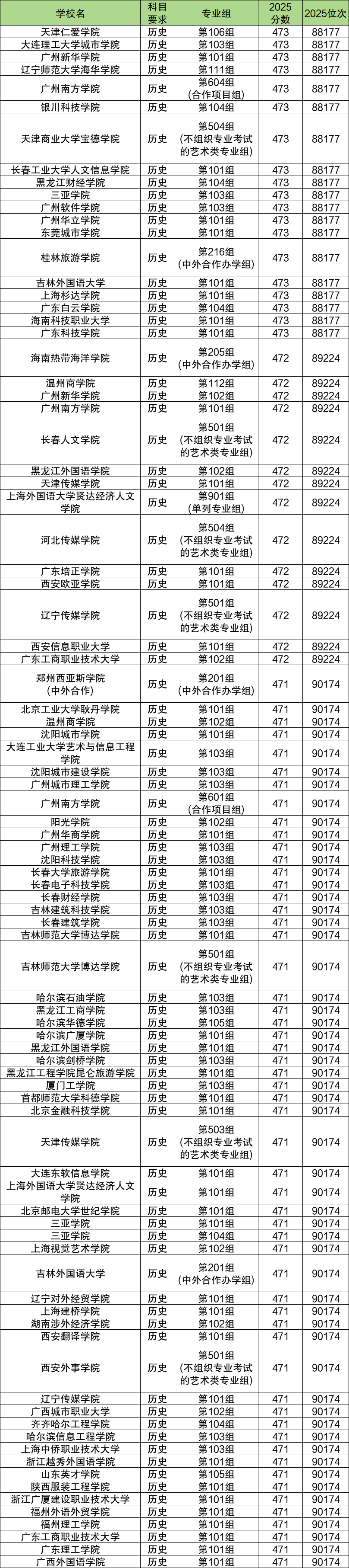 2025年河南历史类本科线附近(471分到473分)能上的本科院校一共有76个,排名靠前的有天津仁爱学院(第106组,88177名)、大连理工大学城市学院(第103组,88177名)、广州新华学院(第101组,88177名)等,这些属于本科线附近考生可以冲一冲的学校。