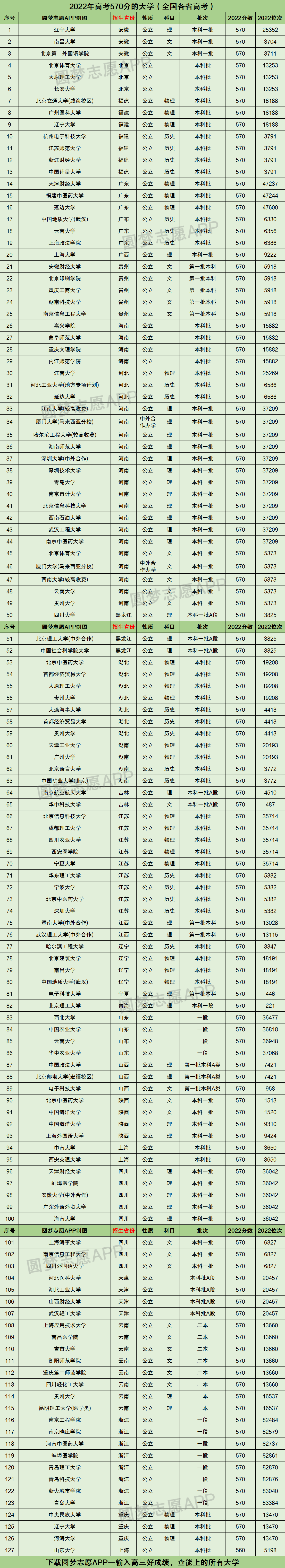 一、570分左右能上什么好的大学? 根据圆梦志愿APP提供的数据,小编为大家整理了全国各省市2022年高考最低录取分数线为570分的大学名单,各省合计一共有127所,其中含125所公办大学、2所中外合作办学院校、1所港澳台合作办学院校。下图为具体的名单: 二、2023年高考570分可以报考的学校 高考570分可以报考的学校其实非常多,不过同学们在择校时切莫只对比往年录取分数线为570分的大学,而是要选择往年录取位次与2023年高考570分对应的位次相近的大学报考,这样被录取的机会才更大!