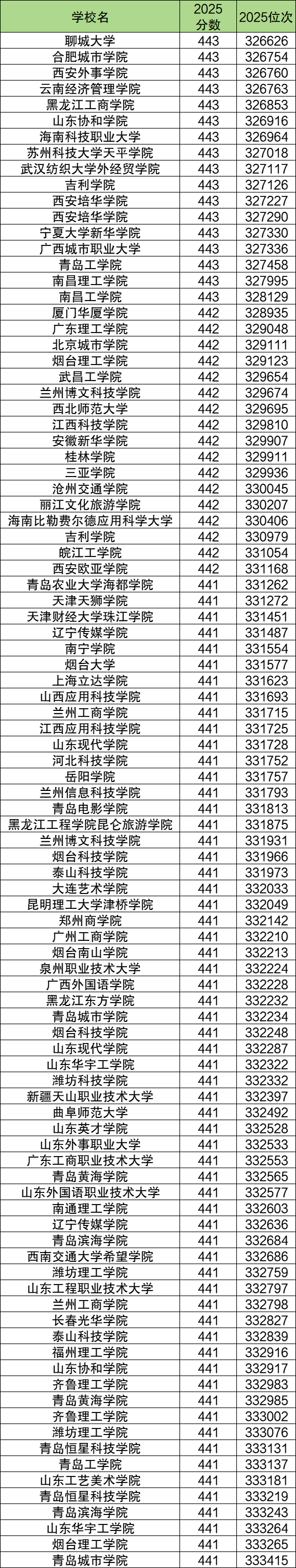 2025年山东一段线附近(441分到443分)能上的本科院校一共有78个,排名靠前的有聊城大学(326626名)、合肥城市学院(326754名)、西安外事学院(326760名)、云南经济管理学院(326763名)等,这些属于一段线附近考生可以冲一冲的学校。