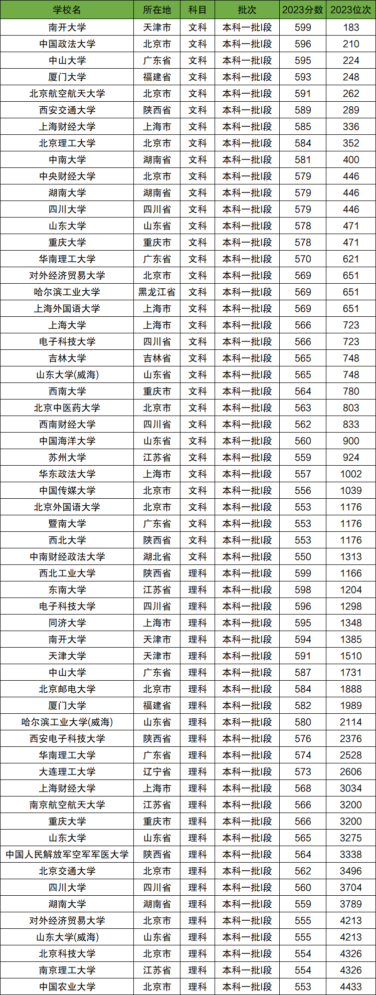 下表为2023年全国大学在甘肃高考中,录取分数在550分的大学名单。