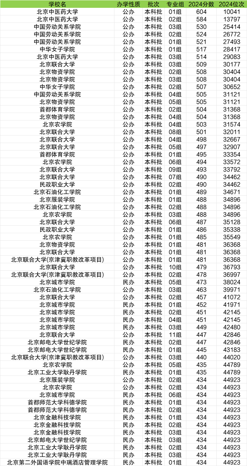 以北京2024年的招生数据为例,北京各二本大学的录取线在434-604分之间,位次在10041-44923之间。