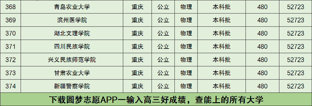 一、480分左右能上什么大学? 根据圆梦志愿APP提供的数据,小编为大家整理了全国各省市2022年高考最低录取分数线为480分的大学名单,各省合计一共有374所,其中含282所公办大学、92所民办大学、1所中外合作办学院校。下图为具体的名单: 二、2023年高考480分可以报考的学校 高考480分可以报考的学校其实非常多,不过同学们在择校时切莫只对比往年录取分数线为480分的大学,而是要选择往年录取位次与2023年高考480分对应的位次相近的大学报考,这样被录取的机会才更大!