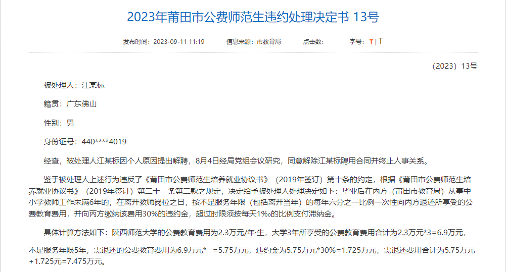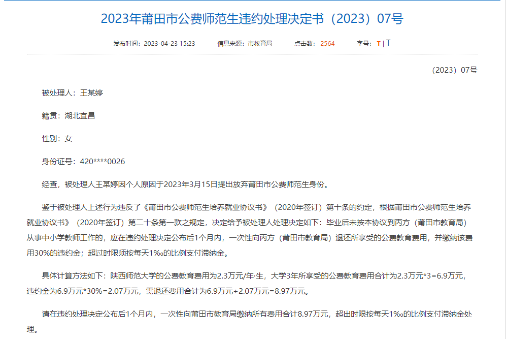 关于违约金赔偿:根据规定,没有按时到校履约,完成中小学教育的公费师范生要在处理决定公布后缴纳违约金,在一个月内、一次性退还所享受的所有公费教育费用,并缴纳该费用的30%作为违约金。以莆田某位学生为例,该生因个人原因放弃公费师范生身份,一次性缴纳8.97万元。具体计算方式如下: