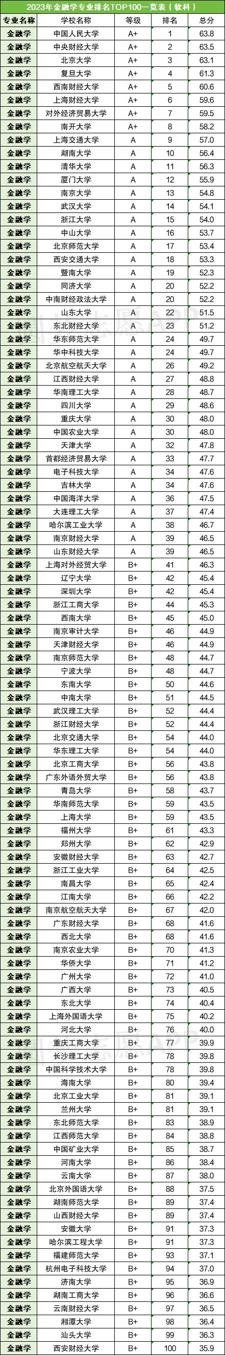 在软科2023年金融学专业大学排名中,整理了202所院校的金融学专业排名情况,由于本文篇幅有限,在此整理的是金融学排名前100的院校榜单,如下: