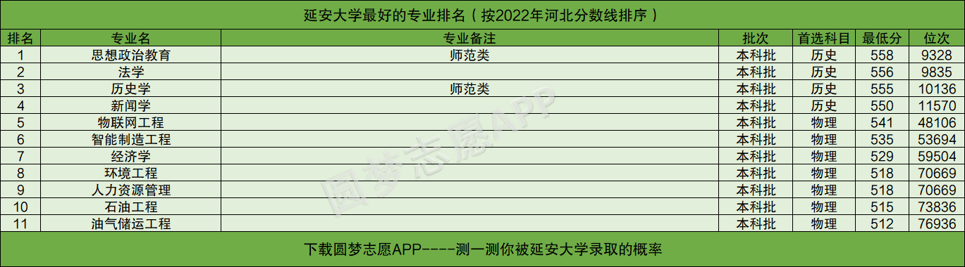 由于陕西省教育考试院目前还未公布2022年的专业分,所以本文将以延安大学在河北2022年高考的录取情况为例,为大家展示延安大学最好的专业排名。