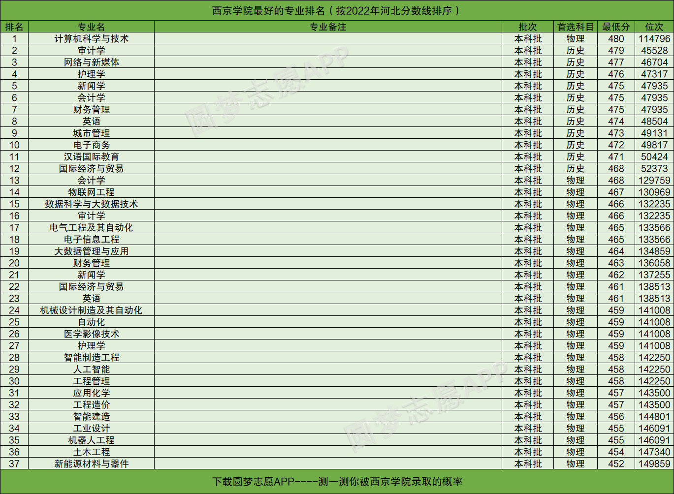 友情提醒:下载圆梦志愿APP,可查阅西京学院在你的高考省份各专业的录取分数线、位次排名。(各大手机应用市场均可下载圆梦志愿APP)