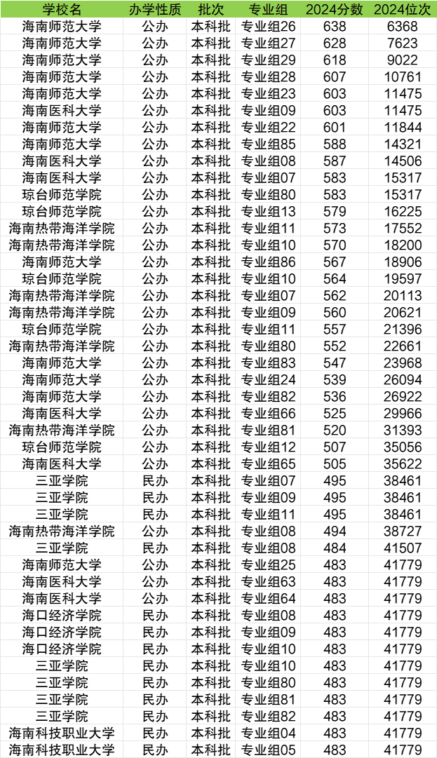 以海南2024年的招生数据为例,海南各二本大学的录取线在483-638分之间,位次在6368-41779之间。