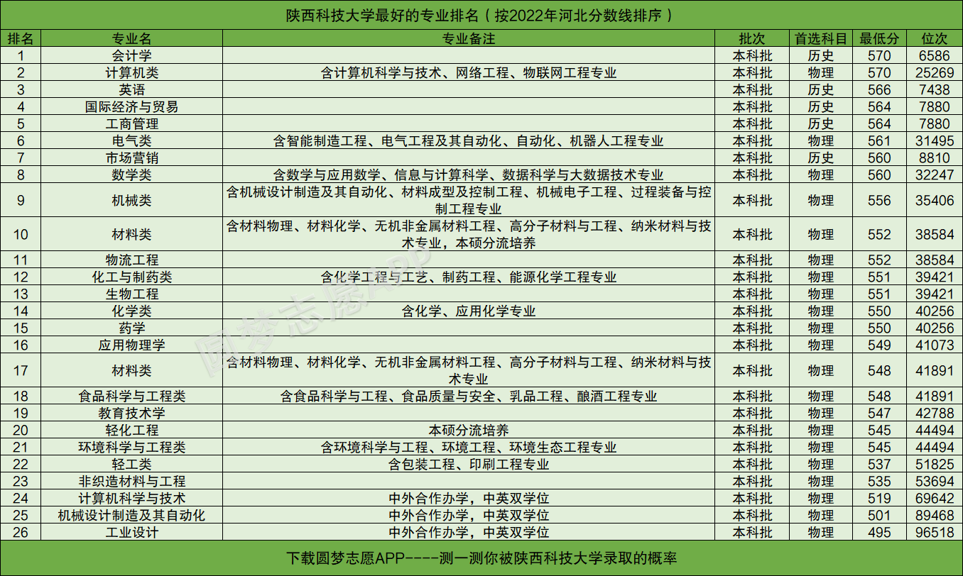由于陕西省教育考试院目前还未公布2022年的专业分,所以本文将以陕西科技大学在河北2022年高考的录取情况为例,为大家展示陕西科技大学最好的专业排名。