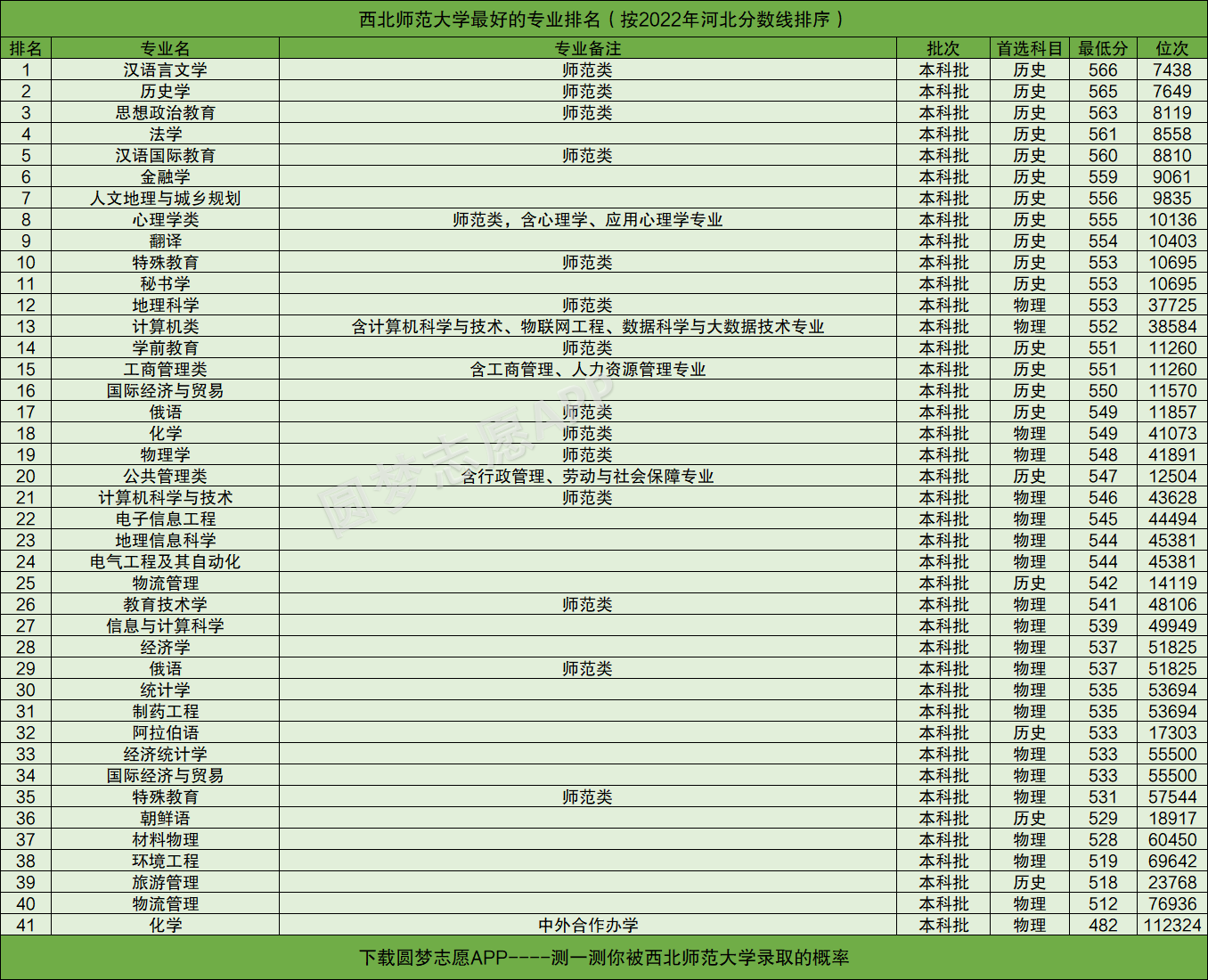 由于甘肃省教育考试院目前还未公布2022年的专业分,所以本文将以西北师范大学在河北2022年高考的录取情况为例,为大家展示西北师范大学最好的专业排名。