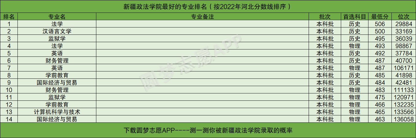由于新疆维吾尔自治区教育考试院目前还未公布2022年的专业分,所以本文将以新疆政法学院在河北2022年高考的录取情况为例,为大家展示新疆政法学院最好的专业排名。