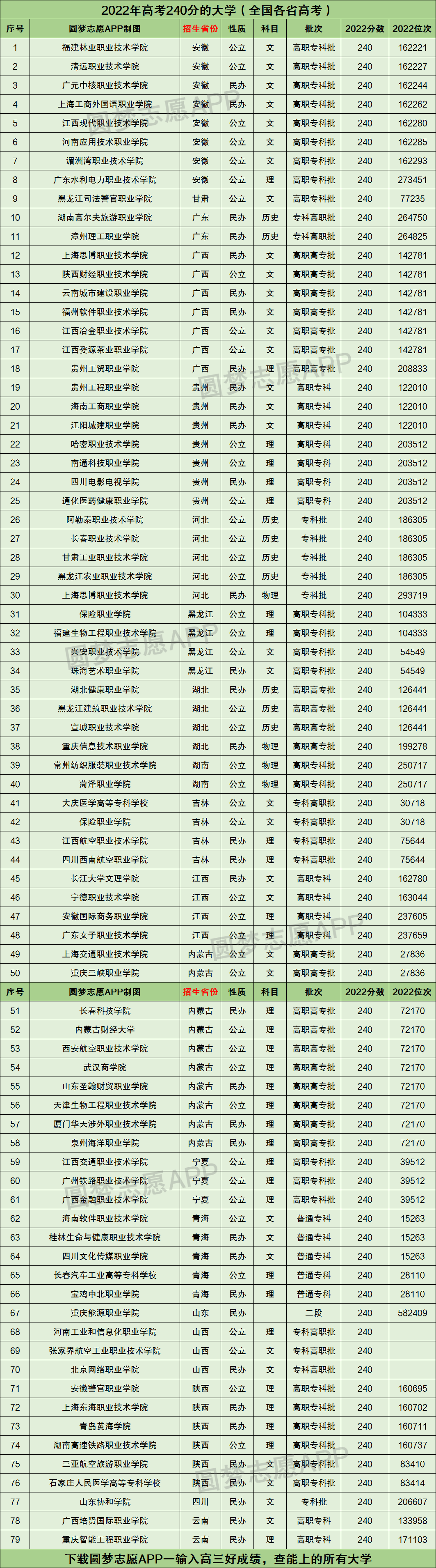 一、240分左右能上什么大学? 根据圆梦志愿APP提供的数据,小编为大家整理了全国各省市2022年高考最低录取分数线为240分的大学名单,各省合计一共有79所,其中含44所公办大学、35所民办大学。下图为具体的名单: 二、2023年高考240分可以报考的学校 高考240分可以报考的学校其实非常多,不过同学们在择校时切莫只对比往年录取分数线为240分的大学,而是要选择往年录取位次与2023年高考240分对应的位次相近的大学报考,这样被录取的机会才更大!