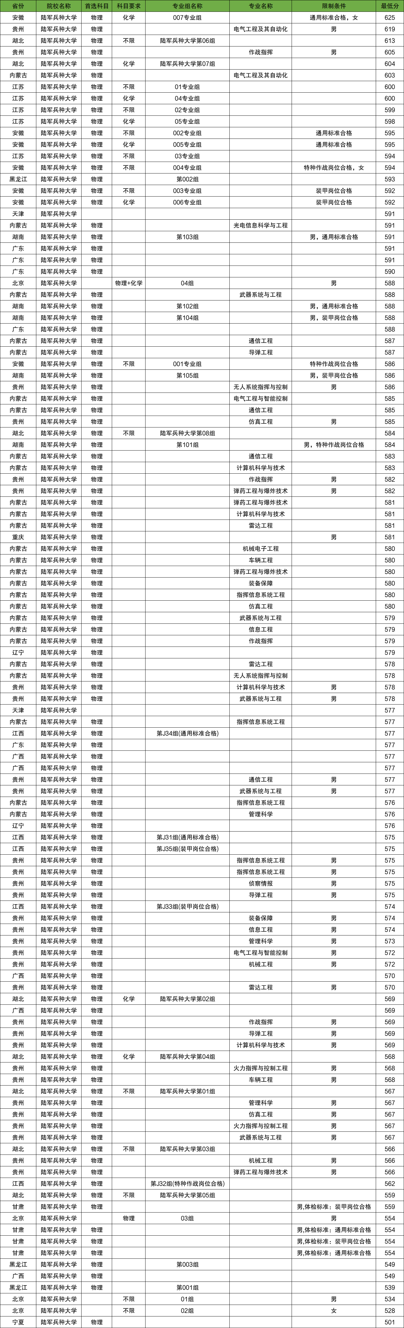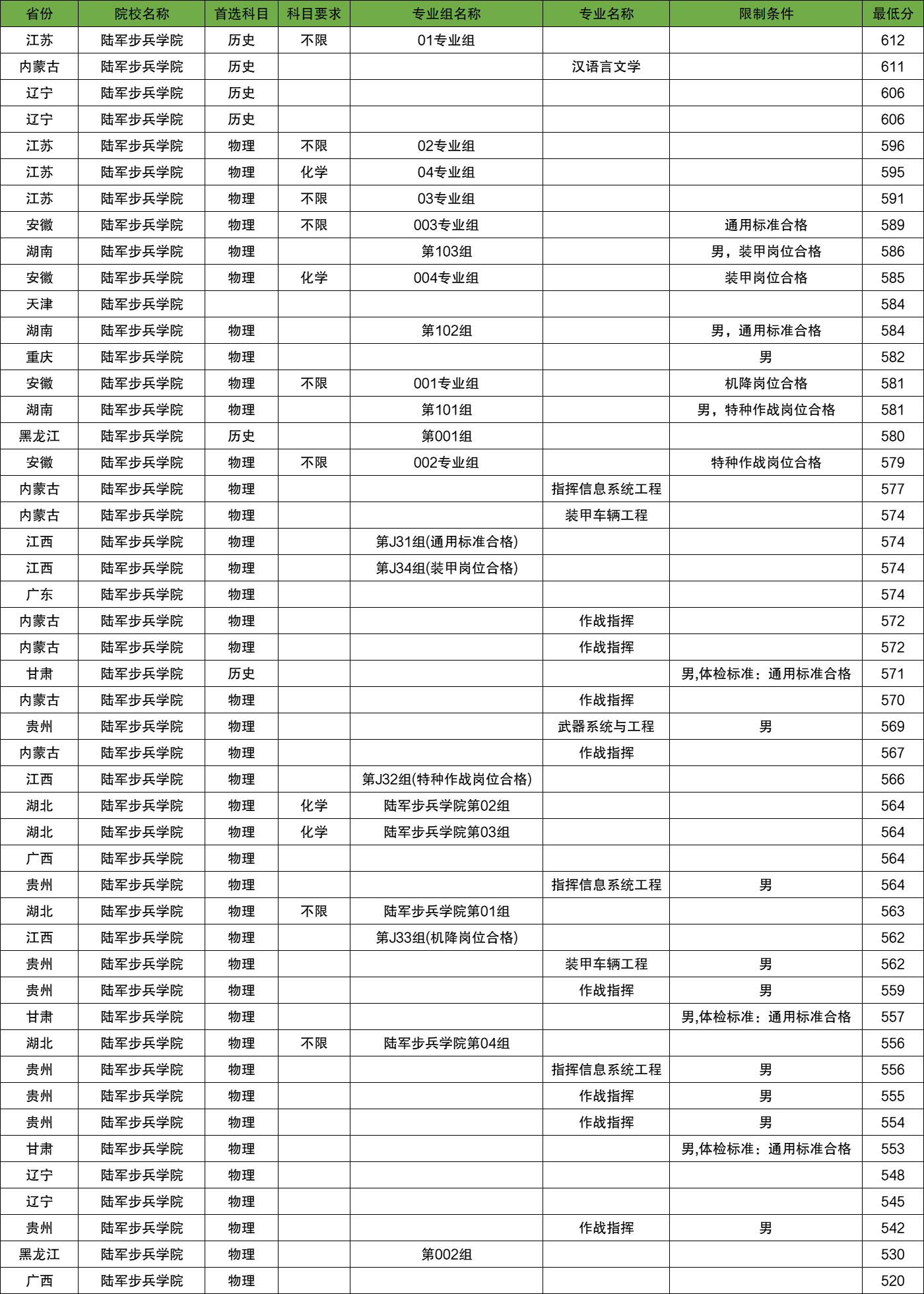 江苏:陆军步兵学院在江苏物理类最低录取分数线591分;