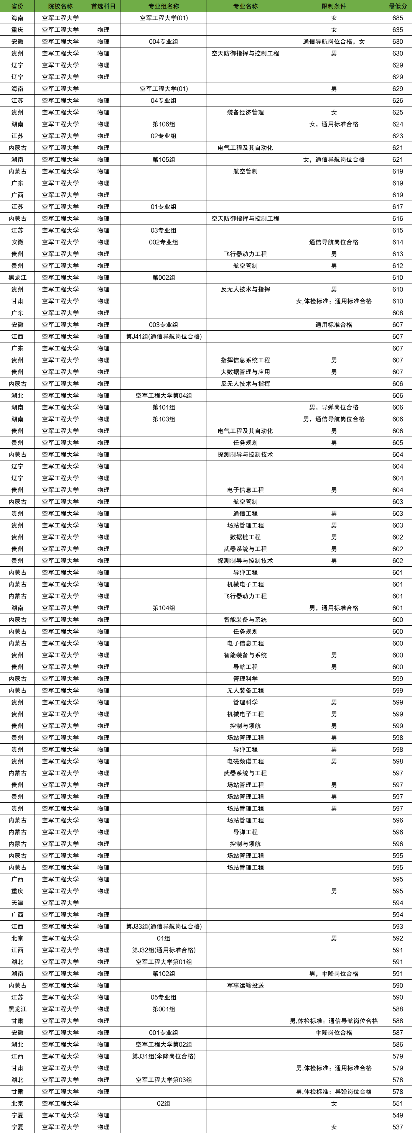 广西:空军工程大学在广西录取分数线为594分;