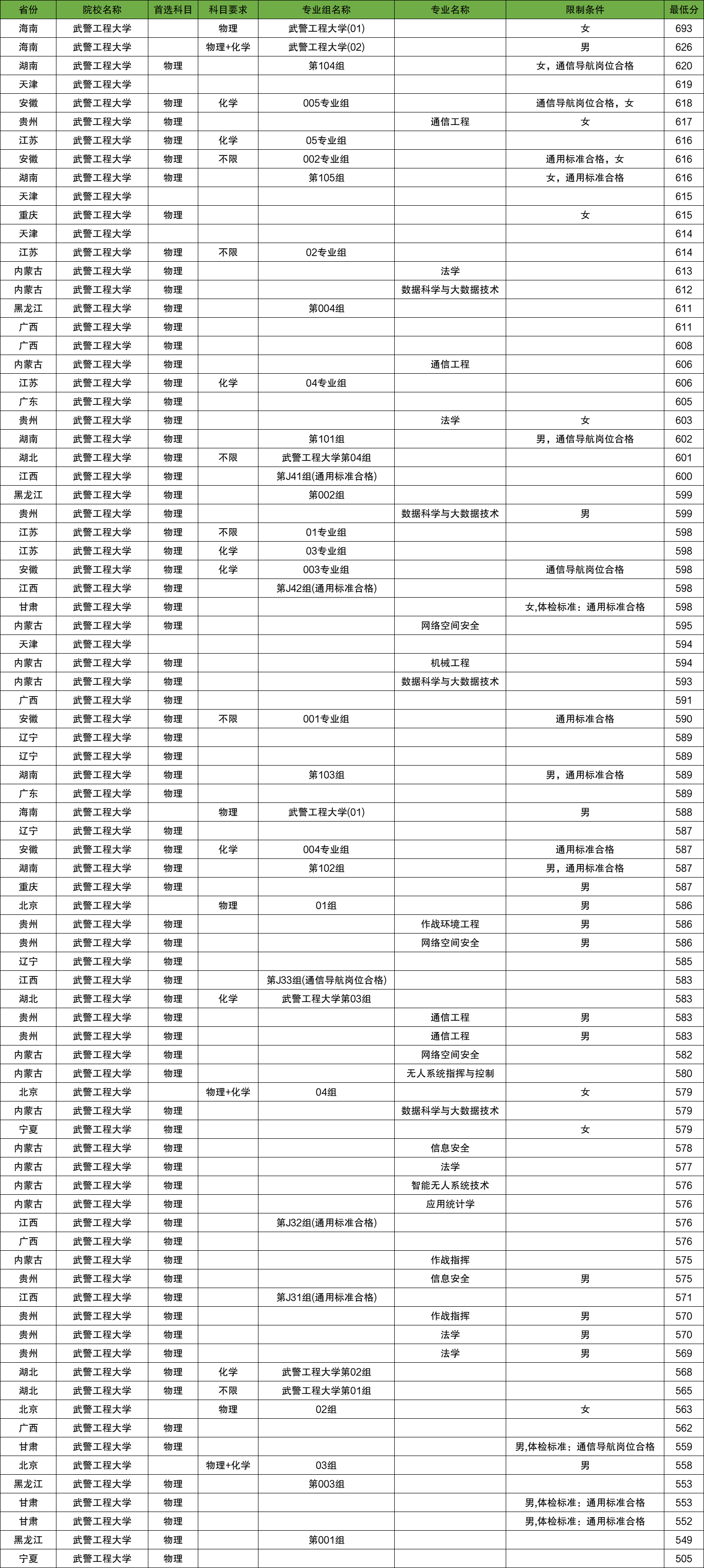 2025年武警警官学院在全国各省录取分数线一览表: