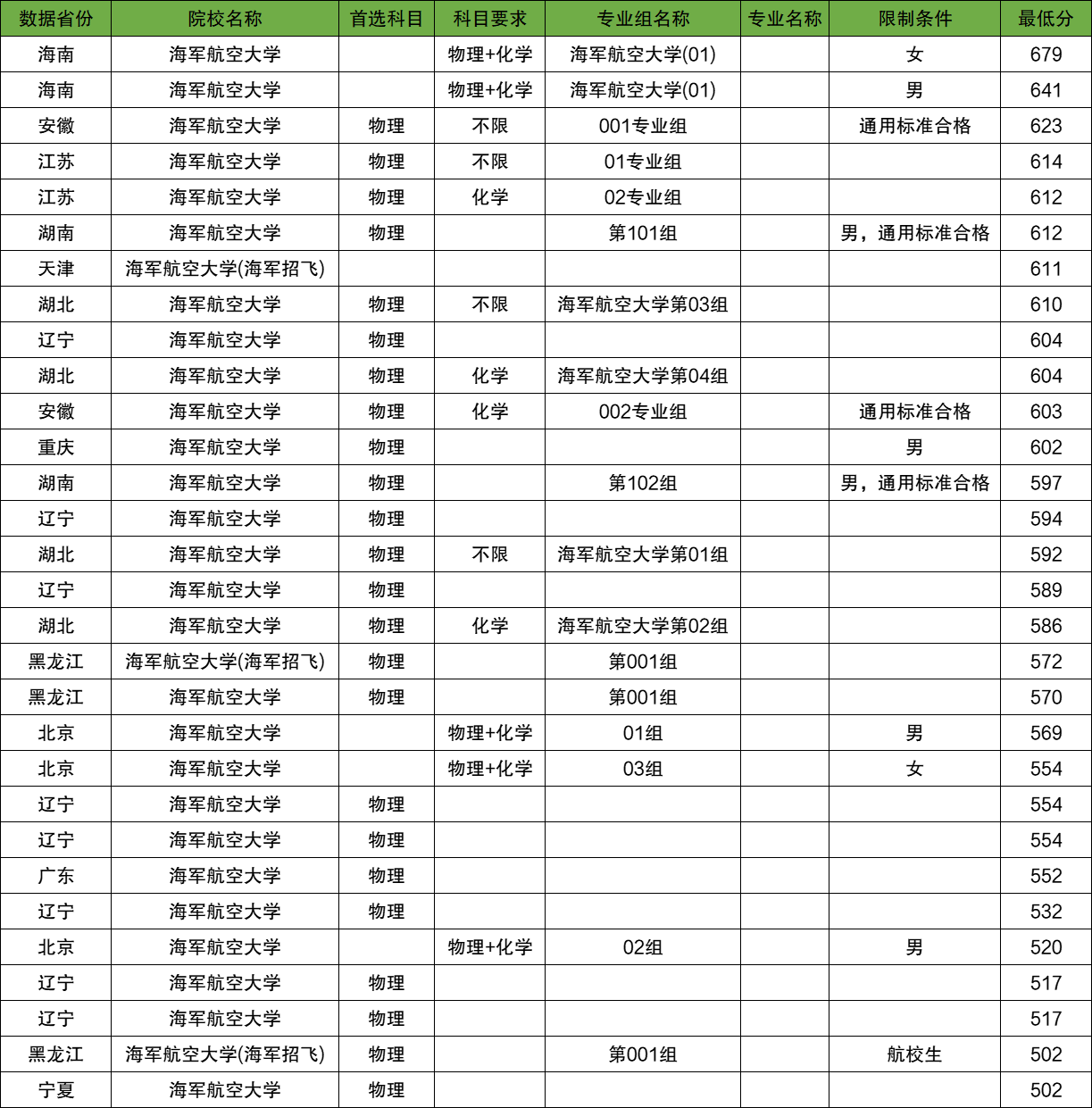 安徽:海军航空大学在安徽物理类最低录取分数线为603分;