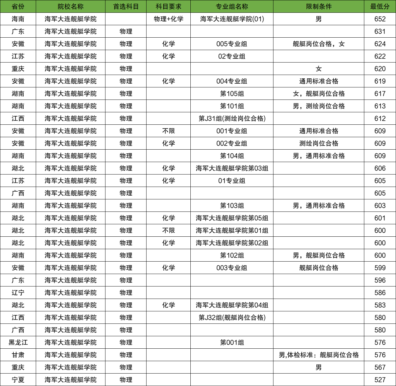 安徽:海军潜艇学院在安徽物理类最低录取分数线最低为601分;