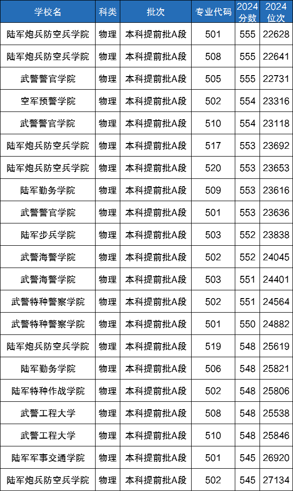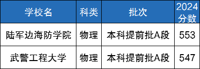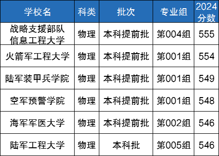 2024年贵州省的550分左右(545-555分)能上的军校一共有10所,均为本科提前批A段录取的院校。