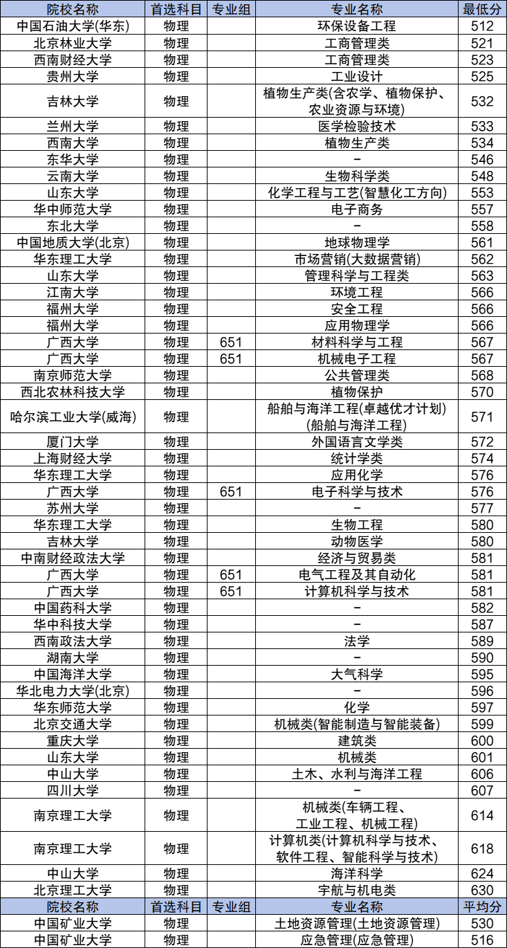 2024年各大学高校专项计划在广西物理类的招生专业要多于历史类,物理类各大学高校专项计划各专业的录取分数线在512分-630分之间;录取分数最高的是北京理工大学宇航与机电类专业,最低分为630分;录取分数最低的是中国石油大学(华东)环保设备工程专业,2024最低分为512分。
