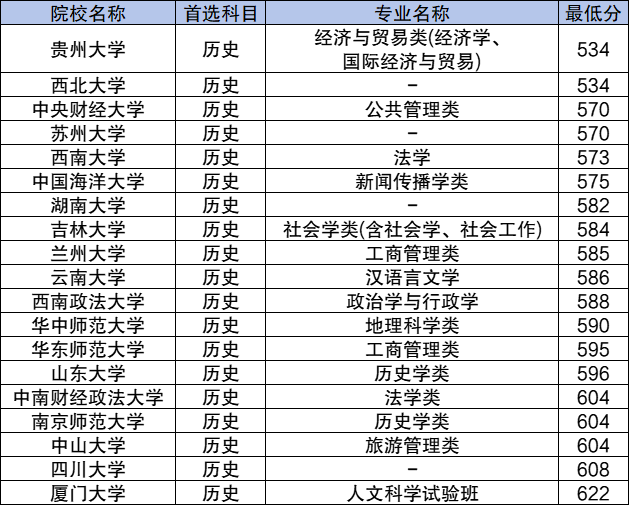广西高校专项计划历史类录取分数最低的是贵州大学经济与贸易类(经济学、国际经济与贸易)专业和西北大学,2024年最低分为534分;相对较低的还有中央财经大学(公共管理类570分)、苏州大学(570分)、西南大学(法学573分)等。