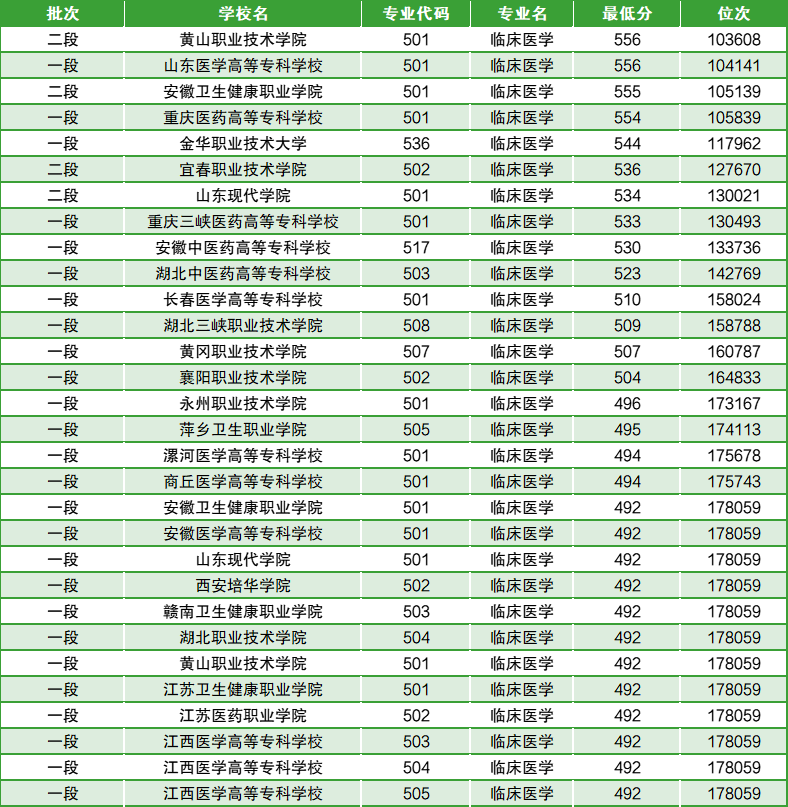 2024年各大学临床医学专科录取投档分数范围在418分~556分之间,最低分都在二段线149分以上,属于高分专科专业。