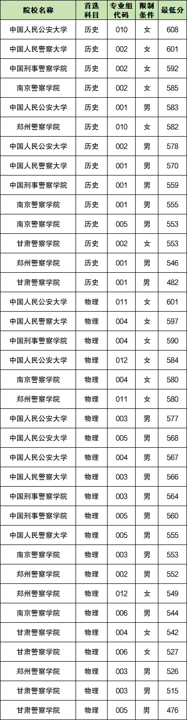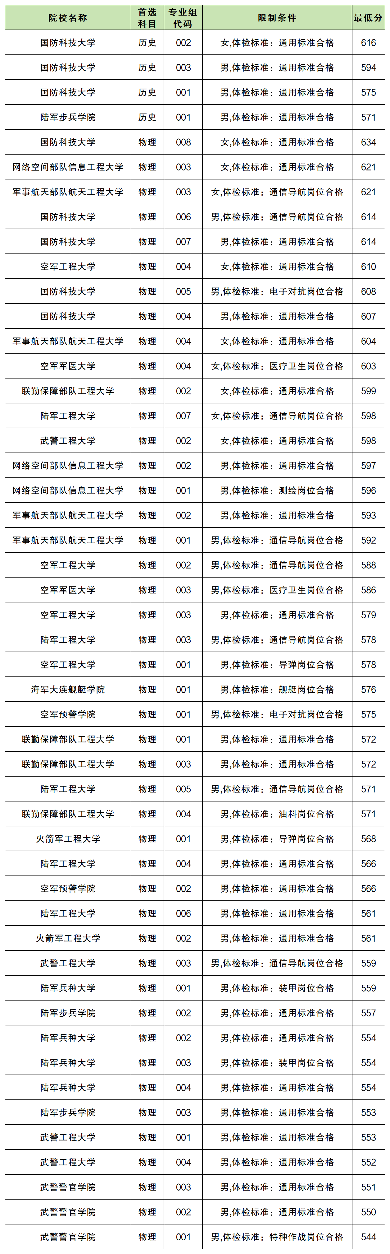 物理类:最低544分,对应武警警官学院001组(男生,特种作战岗位合格)。