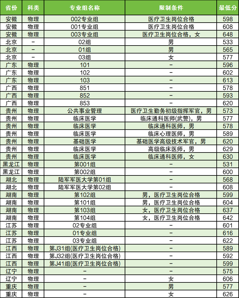 而在明确标明了性别限制的地区,陆军军医大学招收男生的录取分数线为533分-629分、女生的录取分数线为577分-648分。