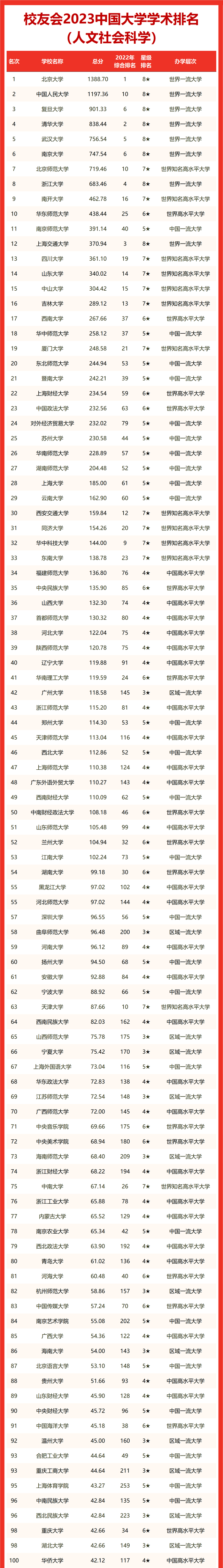 目前各大机构并没有对文科院校进行单独的排名,但对人文社科的学术进行了院校排名,小编以此为基础,整理了人文社科学术排名前100的院校,详情如下: