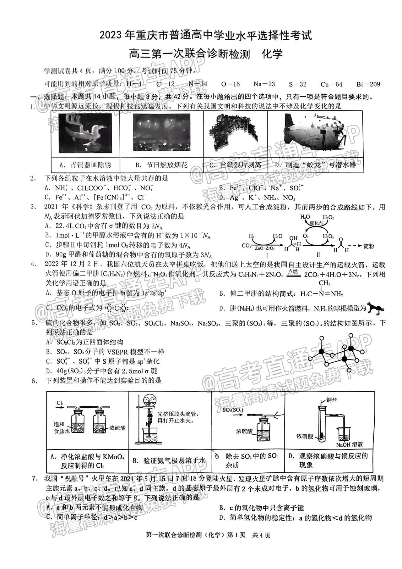 2023重庆一诊化学考试在1月8日开考,高考100网小编会在2023重庆一诊化学答案解析及试卷公布后为大家及时更新