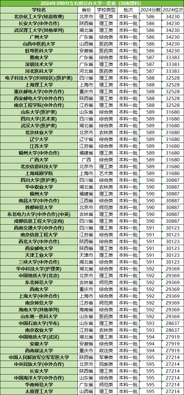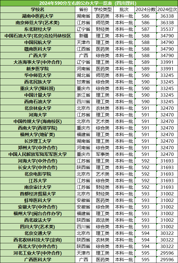 以四川2024年的招生数据为例,在理科方面,590分左右的院校有广西医科大学、河南工业大学(中外合作)、西北大学(中外合作)、西北农林科技大学(定向)、北京交通大学、四川大学(艺术类)、西北政法大学等。关于其余省市590分左右能上的院校,详见下文。