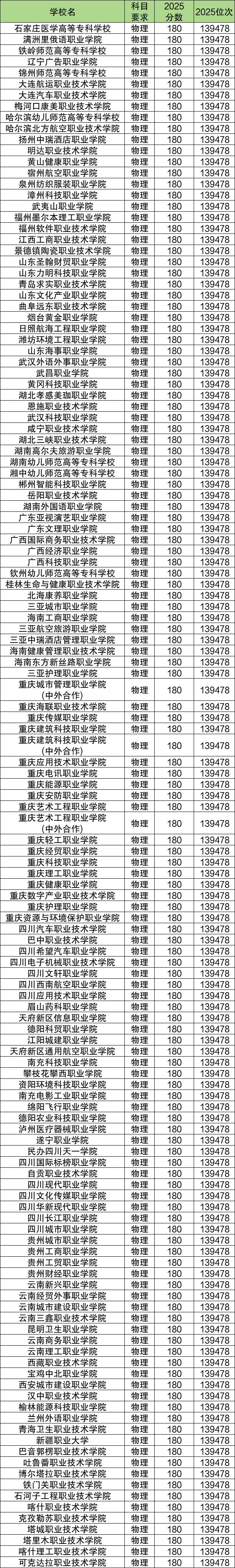 物理类:专科批分数线为180分,对应位次是139478名。
