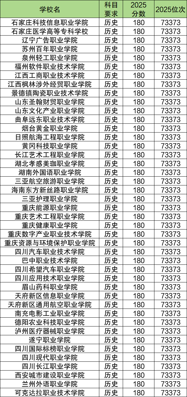 历史类:专科批分数线为180分,对应位次是73373名。